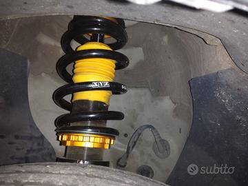 assetto a ghiera regolabile coilover, cerchi 8x18, pneumatici Continental Sport Contact 7 al 60%, dischi freno baffati e tubi in treccia,
