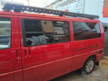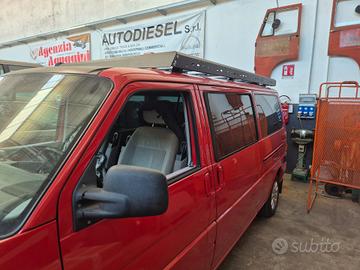 8 posti versione passo lungo 4x4 syncro doppia porta laterale scorrevole tendalino Fiamma nuovo 2.5 Diesel TDI da 102 cv Aria condizionata anteriore e posteriore Base letto pieghevole in legno Sedili removibili Sedili anteriori ruotabili Retrocamera Non e' allestito camper ma solo sedili 8 posti Webasto originale Porta pacchi da carico Doppio set cerchi lega con gomme tassellate per off road predisposizione blocco differenziale Protezione paramotore
