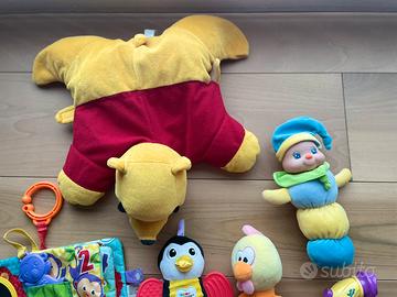 Il set comprende peluche, winnie the Pooh ha cerniera per mettere pigiamino, luciotto con luci e suoni, sonagli, giochini mordi denti, libro morbido fischerprice, alcuni con attacco per passeggino. Tutti funzionanti (forniti senza pile) e disinfettati.