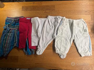Vendo 16 capi (15 pantaloni + una salopette) per neonato taglie 3-6 mesi, cotone o pile, in ottimo stato.