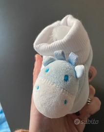 2 tutine ciniglia, 4 tutine cotone felpato, 2 pigiamini jersey (azzurri), 5 set in cotone (tra cui una salopette) e un paio di babbucce in ciniglia. Prenatal e Mawi