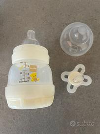 Lotto composto da: - Biberon Philips Avent Natural 0m+, 125ml: usato solo nel primo mese per integrazioni al latte materno. - Biberon Mam Easy Start 0+, 130ml: nuovo. - Ciuccio / succhietto Mam Original Start: nuovo. - sacchetto copri prese. In diversi annunci vendo altri articoli da bambini. Ho occasione di passare per alcuni paesi delle Province di Treviso, Belluno e Padova: provate a chiedere per consegna a mano.