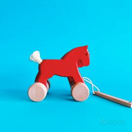 Due cavalli corrono e si impennano fianco a fianco. Quale salterà più in alto? I cavalli galoppano uno dopo l'altro. Quando uno sale, il secondo scende. Insieme hanno sei ruote posizionate in modo non centrale, il che significa che non girano regolarmente. Per far muovere i cavalli bisogna tirare la corda che funge da redine. Quando il giocattolo si muove, ricorda i cavalli che corrono. L'imitazione dei movimenti degli animali introduce il bambino nel mondo animale che se ne interessa, impara ad apprezzarlo e nota i comportamenti degli animali. Tutto il corpo viene coinvolto mentre gioca con il giocattolo, contribuendo così allo sviluppo delle capacità grosso-motorie. Questi cavalli possono essere ottimi compagni quando il bambino muove i primi passi.