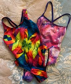 2 costumi colorati da bambina, marca TURBO, resistenti al sale e cloro, taglia 5/6 anni.
