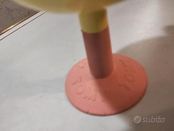 2 giochi vintage anni 90 prima infanzia con parti mobili. uno per attaccare alla culla con una maniglia che, tirandola, fa muovere arti, marca Chicco, l'altro (pulcino) con ventosa, pigiando sulla testa emette suono a trombetta e muove le ali, marca Tomy. tutto meccanico senza batterie