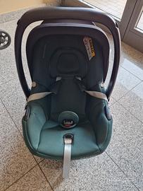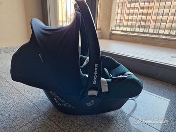 Omologato i-size, con cappottina parasole, si adatta a diverse tipologie di passeggini. Ha il riduttore per neonato e poggiatesta.