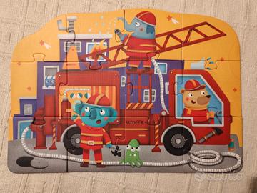 2 puzzle per bambini da 12 e 16 pezzi a tema pompieri e barche. Disegni molto piacevoli, pezzi grossi per bambini 4 anni, il puzzle quando completato ha una forma particolare a nuvoletta. Ottime condizioni, completi di tutti i pezzi. Qualche lieve segno di piegatura sui bordi della scatola. Ottimo come regalo di Natale!