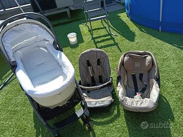 Trio colore beige: navicella in buono stato; ovetto e seggiolino, come da foto, si sfoglia il rivestimento, da coprire con fodera o sostituire il rivestimento. Su internet si trovano tutti i ricambi.