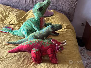 Vendo splendido set composto da tre dinosauri peluche di grandi dimensioni: un maestoso T-Rex verde con bocca aperta e dettagli realistici, un colorato Triceratopo rosso con tre corna e collare decorato, e un dinosauro verde lungo e dettagliato in stile preistorico. Sono morbidi, ben rifiniti e perfetti sia per il gioco dei bambini sia come decorazione per cameretta o sala giochi.