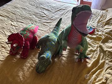 Vendo splendido set composto da tre dinosauri peluche di grandi dimensioni: un maestoso T-Rex verde con bocca aperta e dettagli realistici, un colorato Triceratopo rosso con tre corna e collare decorato, e un dinosauro verde lungo e dettagliato in stile preistorico.