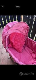 3 pezzi Giocattoli (seggiolone, culla, passeggino) in legno e stoffa. Qusi nuovi per bambole