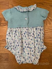 Mai usati marca Fagottino, per neonate di 1-3 mesi (56 cm). In puro cotone. - 1 vestitino bianco con stampe fiori rosa e verde - 1 pagliaccetto parte sopra in maglia verde acqua, parte sotto in tessuto cotone con stampe fiori blu e verde acqua - 1 pagliaccetto bianco con gilet ricamato e bottoni dietro