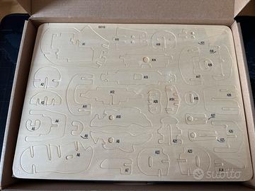 3 dino wooden puzzle. Costruisci da solo il tuo t-rex che cammina. Si muove quando batti le mani. Ha un piccolo motore elettrico. È adatto ai i bambini dai sei anni in su.