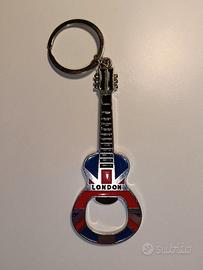 portachiavi chitarra in metallo con bandiera inglese Union Jack, un souvenir di Londra che funge anche da apribottiglie.