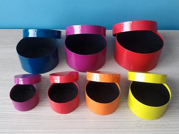 Set 7 scatole rotonde con coperchio Cartone colorato plastificato Diametri: 6,5 - 7,4 - 8,4 - 9,4 - 11,5 - 12,5 - 13,4 cm Impilabili Vendo in blocco a 5 euro