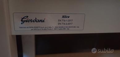 Culla foppa pedretti, Giordani, modello Alice, comprensiva di sponda e cassetto contenitore ottimo per stipare lennzuola o giochi, più materasso in ottimo stato, con fodera lavabile e sfoderabile.