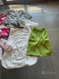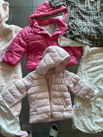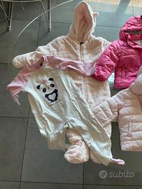Vari vestiti per bambina 12 mesi, tra cui 2 giubbini (Brums e Benetton), un pantalone (Benetton), un vestitino (Chicco) e due tutine (una imbottita Kiabi, mai usata, e una di cotone Original marines) e un sacco nanna 6-18 mesi di Kiabi).