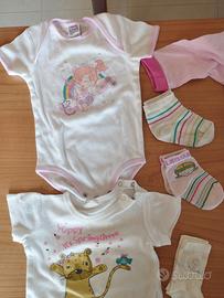 Pacco contenente 15 indumenti per bambina, taglia 6/9 mesi, stagione Autunno/Inverno: - 2 body manica corta - 3 calzini cotone - 1 pantalone rosa - 1 pigiama manica lunga - 3 calze con fiori ( marca Benetton) - 1 pantalone pigiama in ciniglia - 1 cappello con paraorecchie dentro pile fuori lana - 3 calze di lana