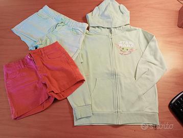 Set abbigliamento bambina anni 9-10 Il set comprende N. 1 vestito sartoriale in cotone e terital bianco a righe rosa da cerimonia n. 2 pantaloncini corti brand Original Marins e OVS n. 1 pigiamino in pail brand Kiabi n. 1 felpa in cotone con cappuccio brand H&M serie Star Wars n. 1 felpa in cotone nera brand Disney serie Minnie Mouse scritta "MINNIE" decorata sul davanti. Condizioni ottime usati per una sola stagione