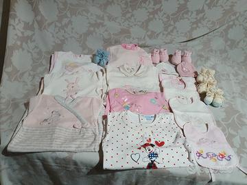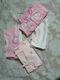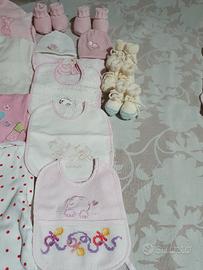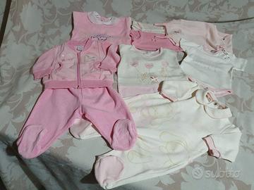 Abbigliamento neonato x bambine da 0 a 6 mesi: n. 5 Tutine ciniglia da 0/6M. n. 3 Tutine cotone da 0/6M. n. 4 Tutine ciniglia da 0/1M. Le tutine a € 5 cadauna. n. 3 Body spallina e 1 m/m da 0/3M. n.1 Body m/m e 1 spalla larga 0/6M a € 2 cadauno. n. 4 Bavaglini e n. 2 cuffie cotone a € 2 cadauno. Babucce a € 1 cadauno.
