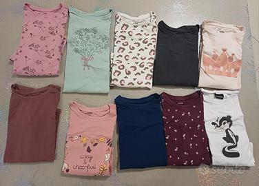 - 1 completino pantalone e top (8 anni) - 1 vestitino (7/8 anni - 128 cm) - 3 pantaloni lunghi cotone (7/8 anni - 128 cm) - 2 jeans (128 cm) - 2 bluse maniche corte (8 anni) - 2 felpe di cotone con cappuccio e zip (128 cm) - 1 maglioncino di cotone (140 cm) - 1 felpa di cotone con zip (134 cm) - 1 coprispalle bianco con applicazioni - 4 magliette di cotone a manica lunga (128 cm) - 6 magliette di cotone a manica lunga (134 cm) - 3 pigiami lunghi di cotone (8 anni) - 7 canottiere intime di cotone (8 anni) - 12 paia di collant (8/10 anni) - 3 camicie da notte di cotone manica corta (8/9 anni)