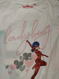 2 magliette maniche lunghe di cotone color bianco con stampa " Lady bug" e " Musik color verde con borchie e stampa;