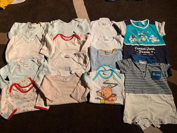 Abbigliamento x bambino di 9 mesi (lotto 8) composto da 2 giacchetti, 3 tutine lunghe, 5 body manica corta, 10 body maniche lunghe, 2 tutine corte, 1 pantalone Original Marines, 1 camicia, 1 Gilet Disney, 1 felpa, 3 maglie maniche lunghe. Tutto a 65,00€