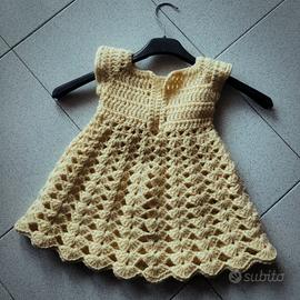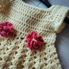 Abitino Bambina 3/6 mesi in lana, fatto a mano, colore giallo uovo e fucsia.