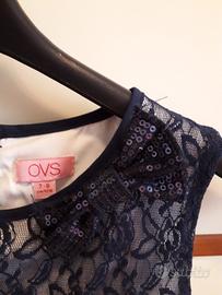 Vendo abitino elegante, smanicato, in pizzo blu con fiori, foderato. Ha fiocco di paiette blu davanti. Nastrino in vita che si lega dietro.