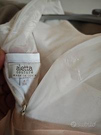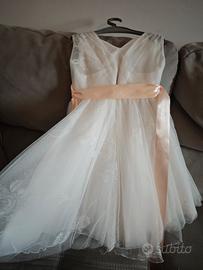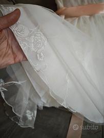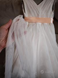 Stupendo abito in tulle color bianco latte, gonna ampia decorata con motivo floreale brillante. L'abito è smanicato, presenta uno scollo a V incrociato ed ha una cintura in tulle da fissare con fiocco in vita. Viene venduto con una seconda cintura in tulle bianca. La fodera è in mussola di cotone, perfetto per la primavera/ estate, per un matrimonio, un battesimo oppure una comunione. Taglia 4 anni - 104 cm Valore originale circa 300 euro.
