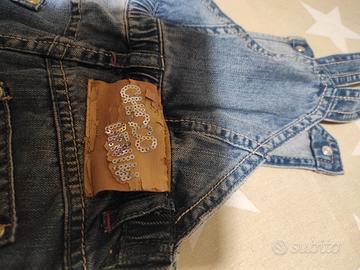 Abito salopette per bambina in denim, marca Chicco, taglia 92 cm - 24 mesi. È stato usato pochissimo; l'unico difetto è l'etichetta sul retro che si sta rovinando.