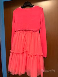 In cotone e poliammide (nylon), usato per un matrimonio poi lavato in tintoria e stop! Nuovo insomma. Va bene anche fino a 14 anni