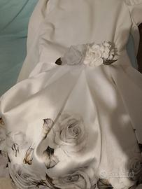 Abito elegante lunghezza al ginocchio con manica lunga colore bianco con disegno di rose grigio (anche da cerimonia come comunione, damigella o cresima) usato una volta sola, condizioni ottime, completo di cintina in stoffa con fiori a rialzo