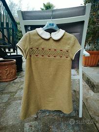 Vendo abito taglia 6 anni pura lana ricamato a mano punto smock con roselline punto vapore . Rifiniture sartoriali. Colletto e manica profilate . Foderata puro cotone. Orlo fondo a mano