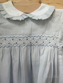 Vendo abito taglia 2 anni in puro cotone ricamato a mano punto smock . rifiniture sartoriali , colletto in Piquet con rousc ,foderato in cotone , orlo rifinitura fondo a mano , bottoni in madreperla .