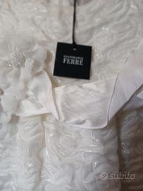 Bellissimo abito nuovo di color bianco senza maniche con un bel nastro nel punto vita tenuto su un fianco da due fiori. Il tessuto molto lavorato è formato dal 50% in cotone e dal 20 % in seta. L'abito è completamente foderato. Può essere usato per una cerimonia o altro. L'abito è di Gianfranco Ferrè comprato presso la CIA di Viterbo. Prezzo 119 €.