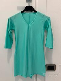In condizioni perfette. Composto da maglia con manica 3quarti e gonna con elastico in vita. La gonna fa un bellissimo effetto ruota quando si fa la piroetta, visibile nella foto. Inclusi accessori nella stessa stoffa (2 polsiere e 1 collana).