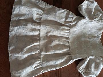 abito da cerimonia, tessuto in cotone tinta avorio con trama in argento, maniche corte a palloncino, girocollo con chiusura con bottone sul retro. l' abito è interamente foderato.