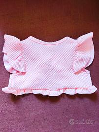 Adorabile set coordinato per bambina, composto da un abitino e un coprispalla, perfetto per occasioni speciali o per un look quotidiano raffinato. L'abito è senza maniche, con una gonna svasata in leggero tulle e con un punto vita impreziosito da delicate applicazioni floreali ricamate. Il coprispalle è caratterizzato da mezze maniche con volant e una chiusura centrale con un singolo bottone.