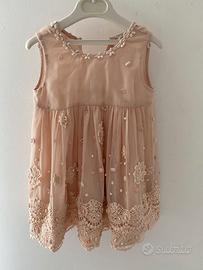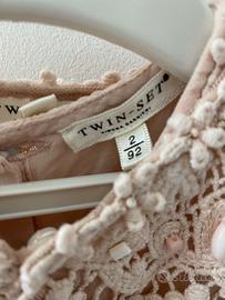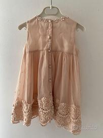 Abito bambina Twin Set, taglia 2 anni (92 cm) color pesco. L'abito è in velo e pizzo, con una fila di bottoncini per tutta l'altezza, nella parte posteriore. Il coprispalla è interamente in pizzo, con un bottoncino ed è amovibile.