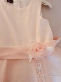 Abito cerimonia per bambina Sarabanda realizzato in chiffon con fodera in cotone colore rosa cipria. La gonna è resa voluminosa da inserto in tulle. Cintura con fiore. Lunghezza sopra al ginocchio e apertura dietro con zip invisibile. Ideale per una cerimonia. Usato una sola volta. Lavato in lavanderia. Misura 152 cm.