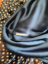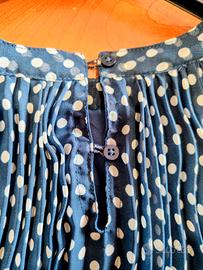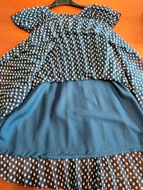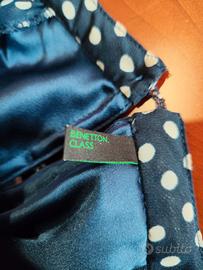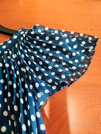 Abito da cerimonia a pois Benetton, perfetto per occasioni speciali. - Fantasia a pois bianchi su fondo blu scuro. - Sottoveste blu - Maniche corte plissé - Gonna plissettata. - Taglia 7/8 anni. Larghezza scollo a barca 20 cm. Lunghezza totale 75 cm.