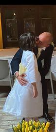 Abito cerimonia bambina. Fatto completamente su misura da Arrigoni Spose. Nella foto mia figlia aveva 8 anni ma l'abito è modificabile. Si può restringere o adattare. È bellissimo. Dietro c'è un fiocco giallo. Usato solo il giorno delle mie nozze. Volendo da abbinare ho anche le scarpe, numero 35 visibili nell'ultima foto. Il prezzo è dell'abito, le scarpe le potrei anche regalare