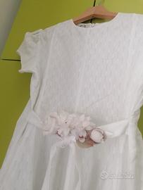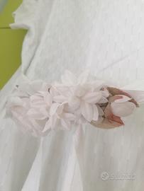 Abitino Caf Firenze, semplice, impreziosito dalla cintura in tulle e un bouquet di fiori, dietro si lega con il suo cinturino per dare effetto di gonna un po' gonfia. Misura 10-11 anni