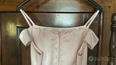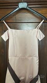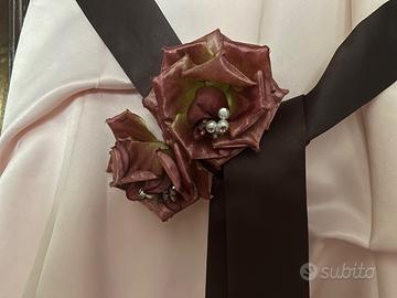Abito da cerimonia damigella per ragazzina di circa 12 anni (vedi misure sotto) con cintura e bolero coprispalle (taglia S spalle 33 cm - altezza 37 cm - lunghezza maniche 63 cm). L' abito (di produzione U.S.A.) totalmente foderato con gonna a doppia fodera (e tulle) è stato indossato per poche ore e pertanto è in condizioni pari al nuovo. Vedi etichette per la composizione. Misure: lunghezza 122 cm senza spalline (8 cm) - seno 41 cm - vita 37 cm - altezza corpino 23 cm.
