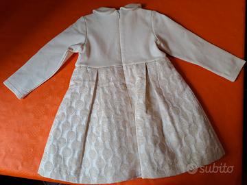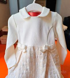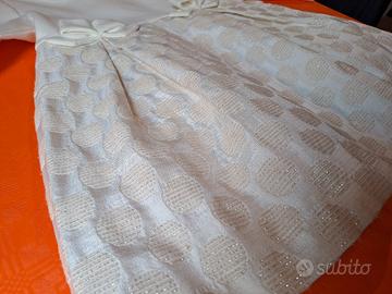 Abito marca Melby by F.lli Campagnolo, a manica lunga con corpetto e ampia gonna foderata in tulle. Il taglio impero, la lavorazione con fili dorati e due piccoli fiocchi sul lato frontale rendono il vestito perfetto per cerimonie e giornate speciali. Chiusura con cerniera sul retro.