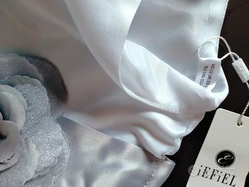 L'abito è in raso e tulle con cintura in raso colore grigio perla. Decorato con un fiore davanti e un bel fiocco nella parte posteriore. L'abito è rifinito con due sottogonne che gli conferiscono un ' elegante ampiezza.