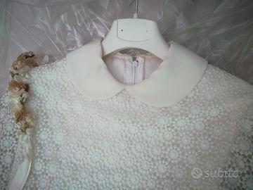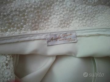 Abito bambina per comunione, cresima, damigella, taglia m, colore panna, con busto e maniche in pizzo e gonna di ottima fattura con lavorazioni nella parte piu bassa, con sottogonna in tulle e fodera in raso, con colletto e chiusura a zip bianca nascosta fin sotto il busto. Ottimo nella fattura, lavorazioni, materiali, di alta classe e pregio. come nuovo della stilista di fama internazionale Angela Porro, stilista di abiti da sposa, del valore di 500 euro. Usato un solo giorno. Possibilità di vendita a mano a corato e limitrofi. Lavato in tintoria.