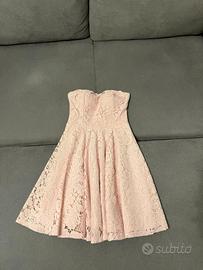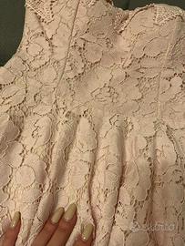 Elegante abito corto color rosa cipria, interamente in pizzo.