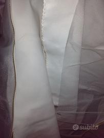 Abito da cerimonia bianco, vintage anni '80, per bambina di circa 8/10 anni. Lunghezza 114 cm, manica lunga 49 cm, girovita 62 cm circa (può essere stretto stringendo la fascia in raso che si annoda sul dietro). Modello abito da sposa, usato una sola volta per la prima comunione. Comprende una base bianca, una sottogonna in tulle, con sopra un tessuto trasparente molto lucido, di cui sono fatte anche le maniche, con orlo in raso. Chiuso dietro da zip profonda. Confezionato a regola d'arte da ditta specializzata. Viene venduto nelle ottime condizioni che si vedono in foto, privo di macchie e ingiallimento, solo l'orlo della gonna che ha toccato il pavimento, sul retro, è leggermente ingrigito. Eventualmente, secondo il gusto dell'acquirente, si lava a secco, per rinfrescarlo, a cura dell'acquirente presso lavanderia di sua fiducia che sappia stirarlo. È accompagnato da coroncina a cerchio di fiorellini, con pettine. Prezzo moderatamente trattabile.